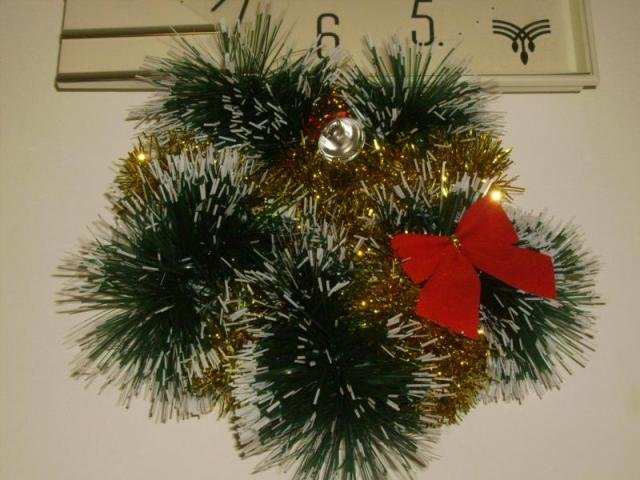Изрязваш от стериопор основата (кръг с дупка - геврек), с големина по избор, като дупката трябва да е достатъчно голяма, за да не се запълни от гирлянда. После намотаваш първо зеления (с разстояние между навивките), после цветния между навивките на зеления и връзваш краищата им един за друг (нали имат тел в тях). След това или запождаш играчките с кукички (от кламер или тел, кабел) за стериопора, а има и такива ( малки звънчета и панделки), които имат ей такива за връзване и готово. Елементарно е, само да ти дойде на акъла  Mr. Green Ето едно малко с малка дупка в средата - става като топчица