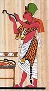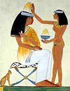 Египтяните са използвали минерални оцветители за да произвеждат грим. Малахит се е стривал върху каменна палитра, за да направят очни бои. Нанасяни са с пръсти или специални моливи, направени от дърво, слонова кост или камък . Тези очни бои са подчертавали очите и са ги предпазвали от силното слънце. По времето на Старото Кралство, зелен малахит на прах бил поставян под очите. /Галето каза вече за червилата  Twisted Evil/. Масла, примесени с парфюми, били нанасяни върху кожата, за да я предпазят. И мъжете и жените са носели парфюми под формата не само на топчета по лицата си, но и под формата на конуси на главите си. Предполага се, че тези конуси са били направени от лой или мазнина, примесени с парфюми, които се топяли постепенно, отделящи аромат. Но за съжаление не са открити образци на конусите  Sad.