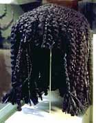 Това е жена носеща перука и парфюм-конус на главата си