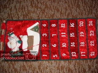 Ето това календарче намерих днес (тъкмо се чудех как ще го майсторя). Хубавото е, че е точно до 24-ти, така ще има шанс и коледното чорапче  Laughing  Под всяка цифра има джобче.