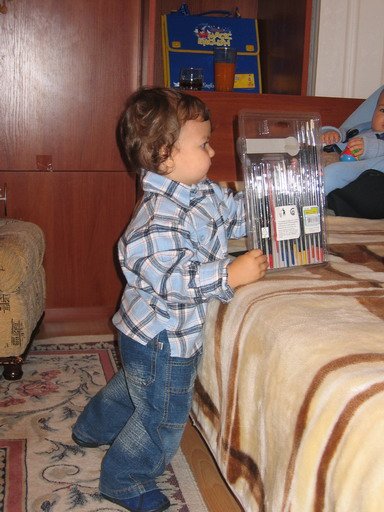 Георги слушка, мама учи, а той ме имитира. Като седне на земята и започне да разглежда едни списания с интерес, и да си говори нещо е много сладка гледка.