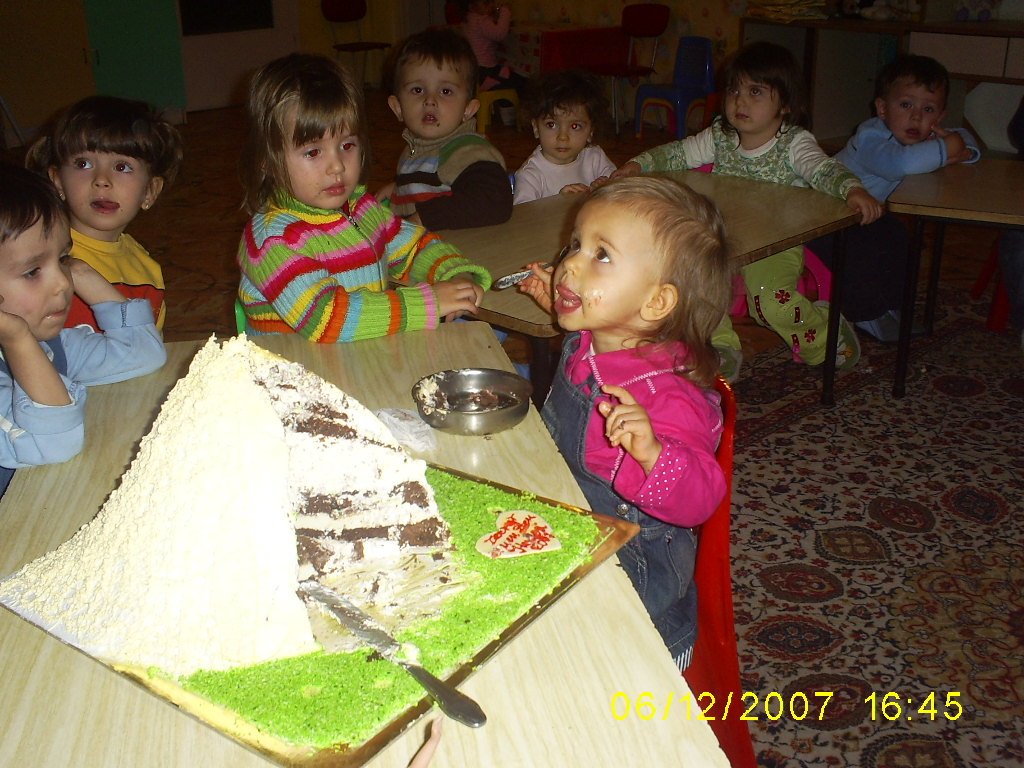 А тук си дояжда тортата - за първи път хапва такова нещо и установи, че е много вкусно, изяде 2 парченца, сама без да и помага никой, е както се вижда всички дечица са приключили, но ние си хапваме спокойно: