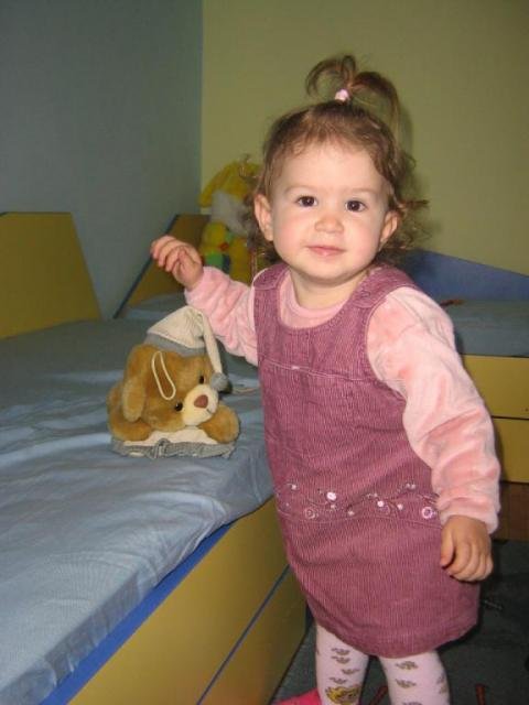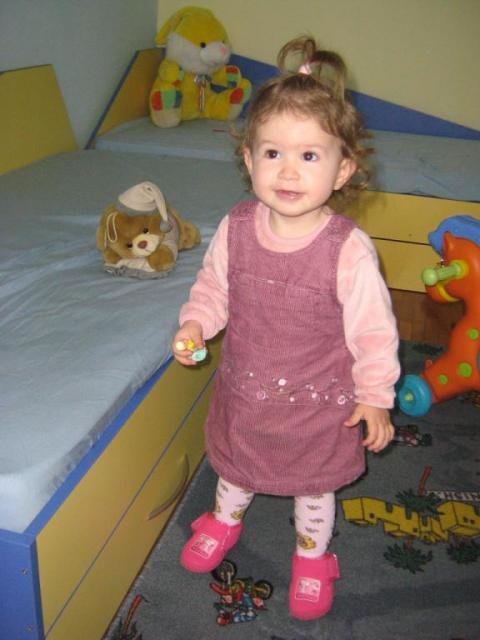 Коте, Тея като я гледам каква е кротка и усмихната на снимките чак не мога да си я представя ревяща. Много е сладка с рокличката. А като видях леглата в детската- да не би вече да спи на легло за големи? Ние сме си още в кошарата.