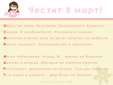 Честит осми март!  Бъдете нежни и красиви, възторжени и вдъхновени! Съхранете женствеността и лъчезарието си! Обичайте и бъдете обичани!