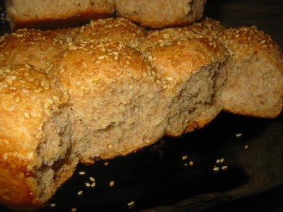 Омесваме еластично тесто и оставяме да втаса до удвояване на обема.След като втаса  разделяме на 16 топчици които нареждаме в намаслена  тавичка.Оставяме отново да втаса на топло около 30 минути.След това намазваме с млякото отгоре и поръсваме със сусам.Печем на 220 градуса първите 15 минути и след това намаляме на 180 градуса и печем още около 30 минути. Simple Smile