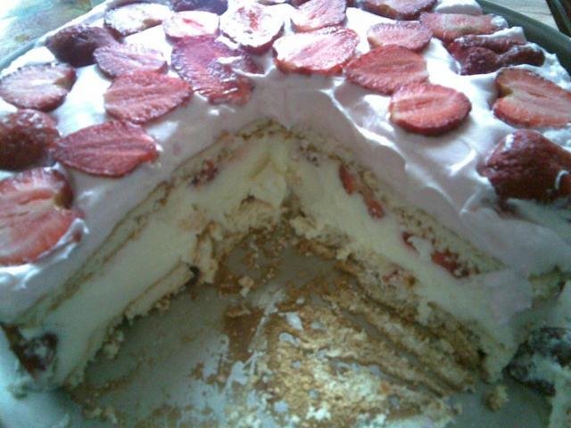 Една лека торта с ягоди.Само един тънък блат отдолу и после крем от: