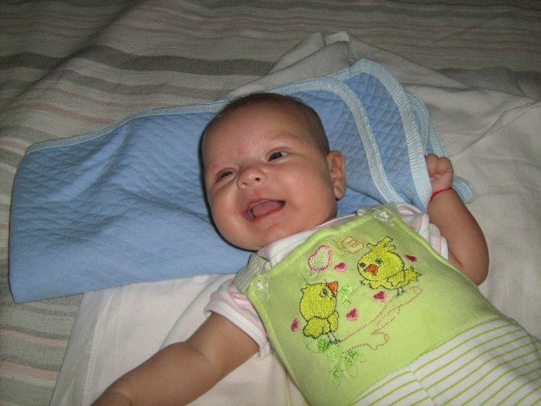 Поля много будува през деня и все съм при нея да се занимаваме. Сега случайно заспа и аз незнам как я приспах, иначе излизаме и сутрин и вечер на разходки и през повечето време кротува. Вече 2 дни не се буди през ноща,като заспи към 22ч, 23ч и се събужда сутрин към 6ч., ама много е смешна сутрин като се събужда и само мести краката търси юмрука и пъшка, но очите не отваря, понякога не я чувам като се е събудила(ами като не издава звуци Crazy)и я заварвам я с крака я с глава между решетките на кошарата hahaha, вдигам я за да и сменя памперса но тя пак не отваря очи и така си яде и пак заспива до към 8ч. През деня все иска да има някой край нея да му се хили, бабите се разтапят направо.