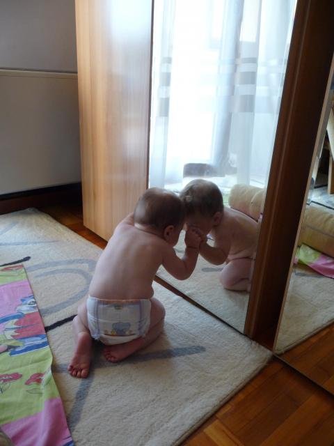 друго, което е научил е да не си пада на главата. сега лази, но предпочита да се хване за нещо да се изправи. обикновено му се изпречва матрака на спалнята ни. изправя се, подпира се с корем и почва да се опитва да докопа нещо от него и понякога губи равновесие, като и двете ръце не държат матрака, тупва по дупе, но преди да си удари главата, подлага лакти. кога пък изхитря толкова