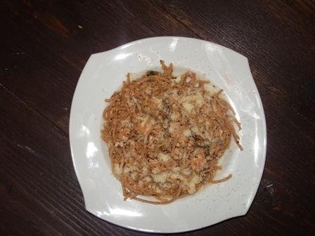 Сварих си пълнозърнести спагети. Запържих ситно нарязан чесън, накълцана на кайма сьомга, ситно натрошено козе сирене (българско, обикновено) в зехтин. Подправки: босилек, риган, розмарин и мащерка, черен пипер. Добавих малко доматено пюре, малка лъжичка захар и накрая миди. Слагат се накрая, защото иначе стават малки и гумени. Изсипах солидно количество пармезан за финал.