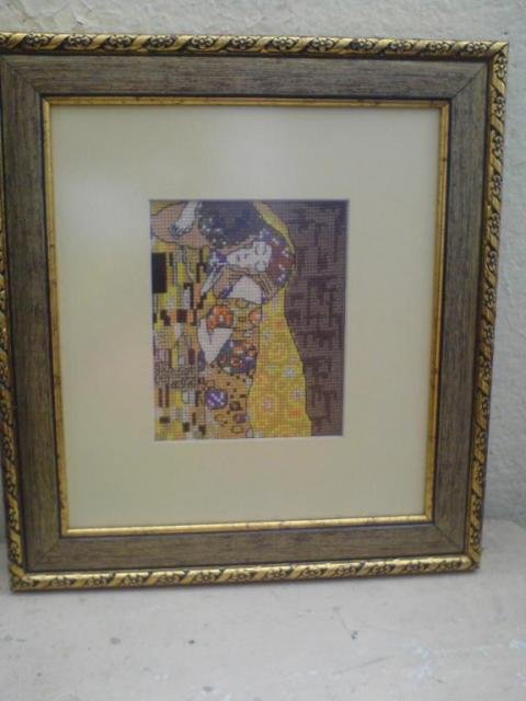 Момичета, страшни красоти сте избродирали. Сега и аз да се похваля с нещо ушито преди няколко месеца Simple Smile. Sissak, и аз уших един от тези Климтчета, миниатюра по Целувката и мога да кажа, че схемите са много добре подбрани, но имаше толкова много ламе, че направо ми скъса нервите. Ето го моето:
