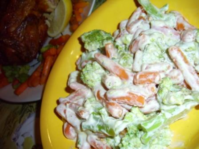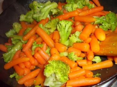 При нас има тази вечер печено пиле, задушени моркови и броколи, с добавка за мен от сметана и синьо сирене.