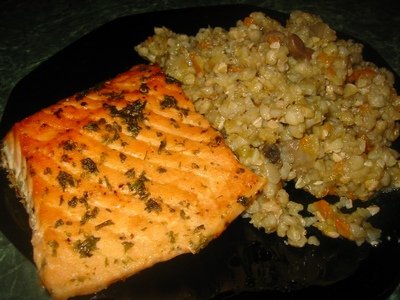 При нас печена съомга с вино и елда със зеленчуци. Simple Smile