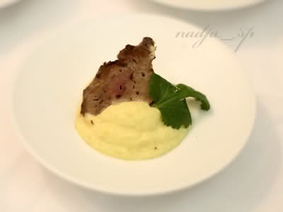 Нашата вечеря беше:Пюре от цветно зеле с фламбиран пилешки дроб, Люти ароматни бадеми и котлети и картофи на фурна.