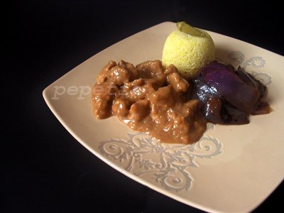 Свинско в сос от фъстъчено масло и сливов мармалад, марокански кус кус и карамелизиран лук