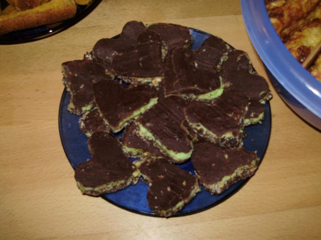 Благодаря ви за хвалбите.. ушите ми станаха като на магаре.. (тъкмо ще мога да сложа още някоя обеца  Mr. Green ). И понеже много се възгордях не мога да не се изфукам и с шоколадово-ментовите сърца, който правих за 14-ти.. Същото така не мога да се стърпя и да не се похваля, че мъж ми този път се беше постарал и ме изненада приятно с подарък ( мацките които ме познават знаят, че тази неочаквана проява на "романтичност" наистина е повод за голяма радост), комплект сатенена нощница и халат и кутия Линдор, който ометох за 1 ден (повярвайте ми успях). Вечерта имахме гости.. смея да отбележа, че си изкарахме добре, разбира се получих малко хвалби за ястията, а ушите ми растяха ли, растяха. Останах доста доволна, даже един от гостите ме изненада с букет бели рози, отдавна не бях получавала такова внимание. Ако се питате къде беше детето.. пратих го у майка ми, върнаха ми го чак на следващия ден - яко разглезен. Починах си доста добре.. и за пръв път от година насам си видях къщата подредена за повече от 30 мин.