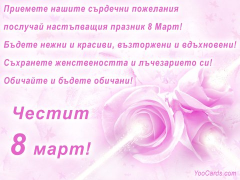 ЧЕСТИТ ОСМИ МАРТ! ДА СТЕ МНОГО ОБИЧАНИ И УСМИВКИТЕ ДА НЕ СЛИЗАТ ОТ ЛИЦАТА ВИ!