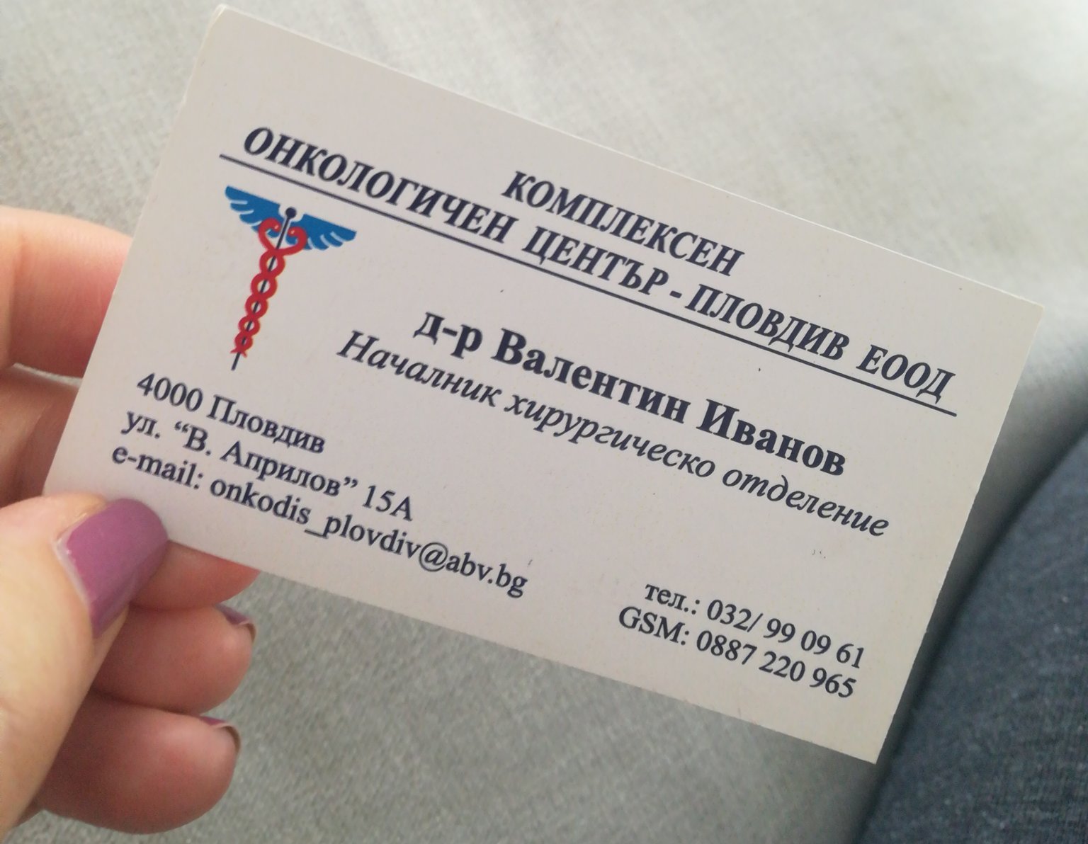 Др Валентин Иванов. Има частен кабинет на бул. Шести Септември. Оперира в онкологията на бул. Васил Априлов.