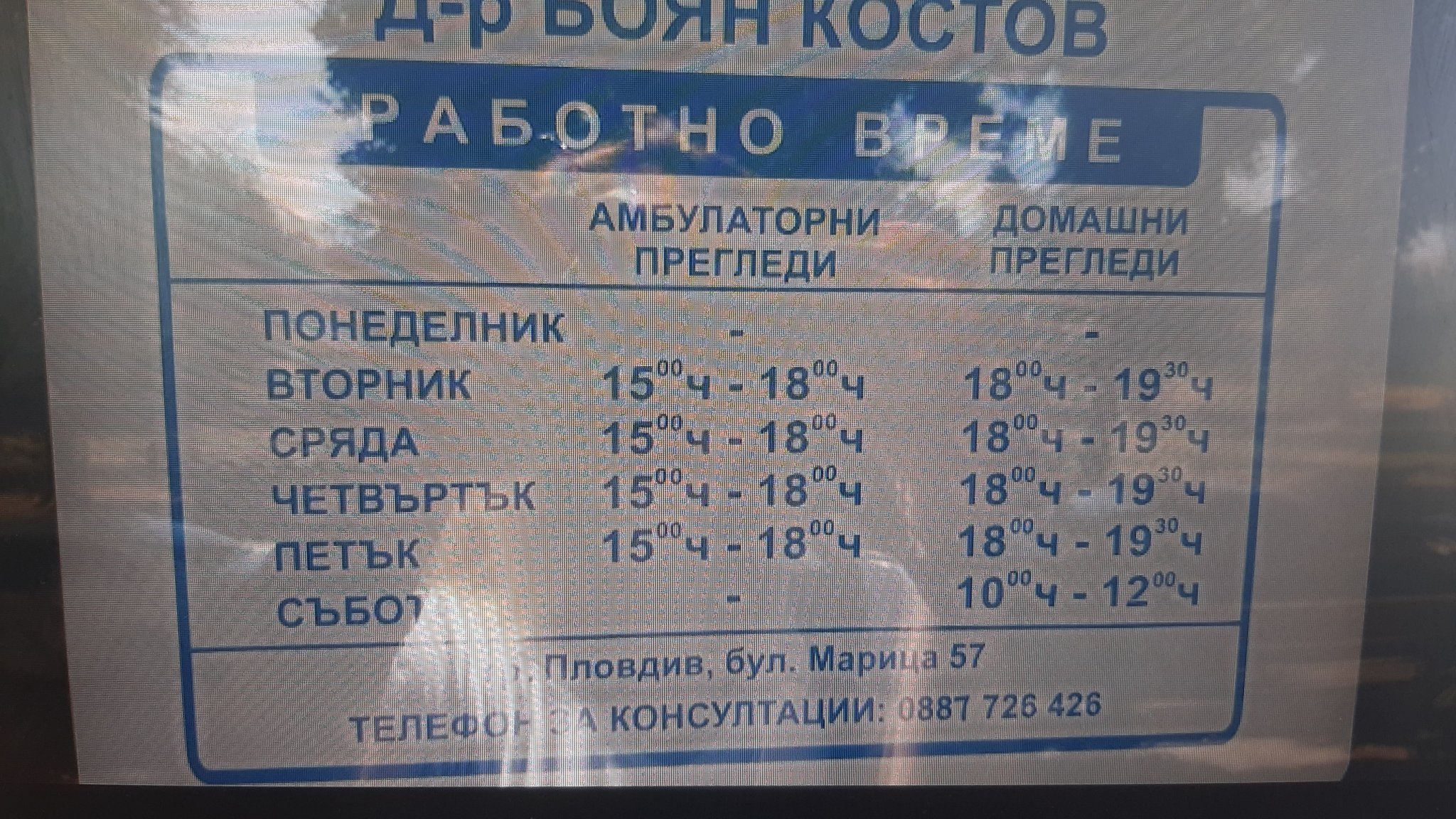 Но за преглед Ви съветвам да се обадите днес, след 16 часа на стационарния терефон в кабинета- 032 653 527 или направо да отидете на място на ул. Костаки Пеев 5, ще почакате, но не вярвам да Ви върне...За мобилния- шанса да се свържете без уговорка е минимален( но, ако е много, много спешно, може да пробвате да ѝ пишете на Вайбър).
