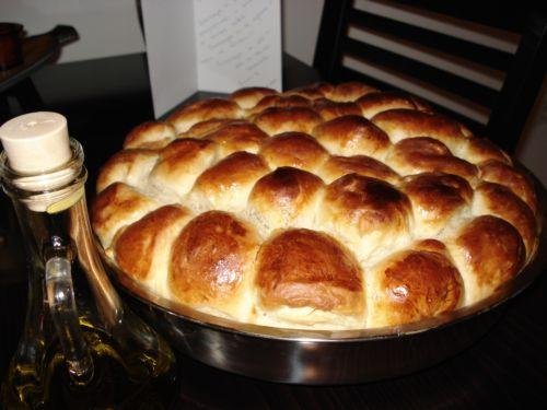 В тавичката се пресява брашното /отделям една чаша за добавяне по време на месене/ и по средата аз правя "кладенче", където слагам олиото, яйцата /като единият жълтък е отделен за намазване/, кис. мляко със содата, солта и втасалата мая. Замесва се тесто, което да не лепи. По време на месене се добавя брашно или олио ако се наложи. Оставям тестото да втаса, като го намазвам отгоре с олио и покривам с кърпа.