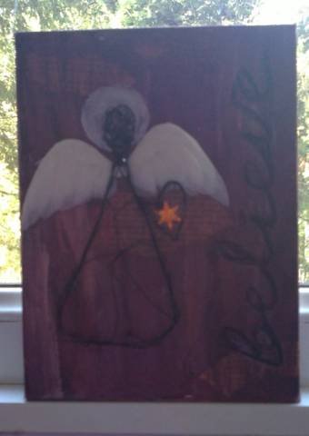 Аз отдавна не бях хващала четка. Ето какво си спретнах днес в любимия ми стил mixed media (т.е. мацотене с к'вото има под ръка) - акрил, моливи, тел, перца и една зведичка от гирлянд, която свети на тъмно: