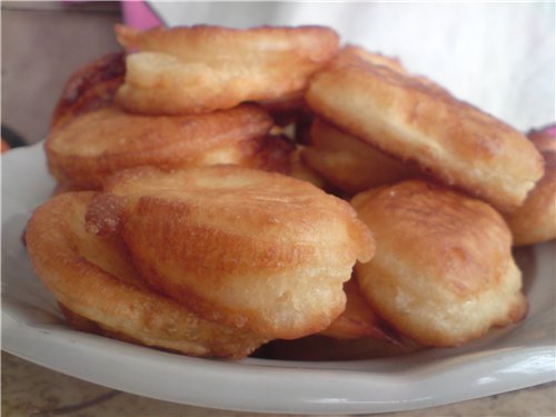 Моите оладушки със закваска (2 яйца, 2-3 суп. лъж. квас, 2 суп. лъж. захар, 1-2 щипки сол, прясно мляко около 200 мл и брашно). Оставих на топло да втаса и когато видях, че има мехурчета по повърхността, разбърках леко и ми се стори, че е готово. Изпържих бухтичките и дори без нищо друго са вкусни. Много нежни и пухкави станаха.