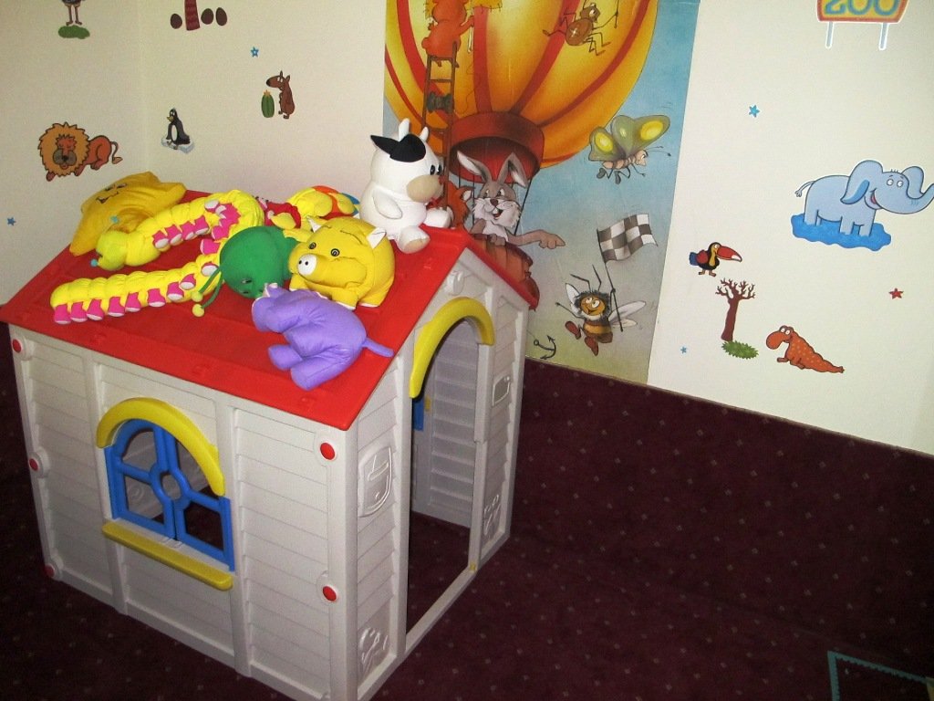 Няма детска стая,нито детски кът!Има чудесен , топъл минерален басейн,и се намира до борова гора,тишина,чист въздух.Дворът е голяма зелена поляна за игри,а сега- зимата, за търкаляне в сняг !Когато е студено всички дечица се събират в фоайето,играят на криеница,гоненица-малки,големи...(достатъчно пространство,не се пуши)Храната-прясна,вкусна,готвено и супи различни всеки ден.На 10-15 мин. пеш от парка при хотел"Двореца"и хубавата външна площадка на хотел "Рич".Има вече и СПА.