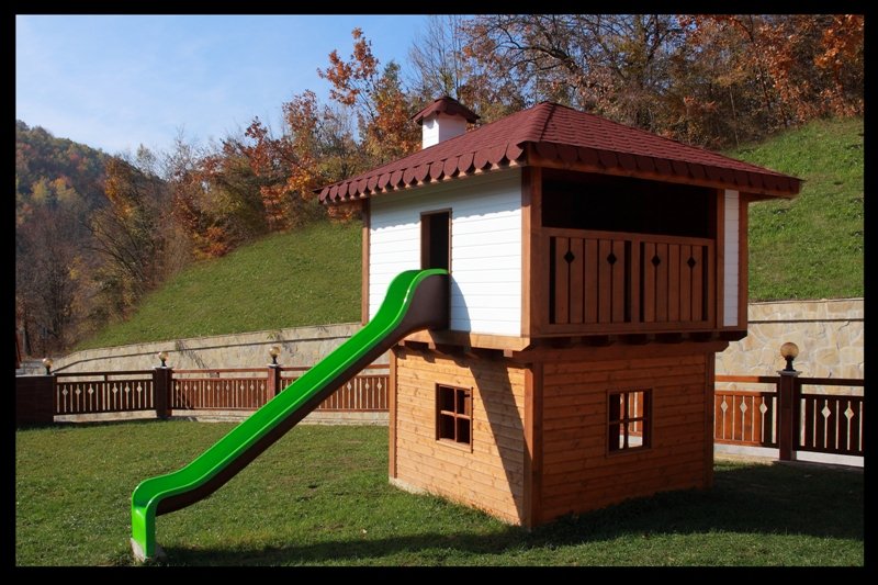 Външният детски кът/пак го има на снимките/  е на втория етаж до ресторанта и басейна и също е сравнително малък. Малка полянка и къщо-пързалката, която пък ми се стори леко опасна за по-мъничките дечица.