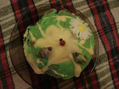 С чувство за хумор ви представям и един къпкейк, който правих по изричната поръчка на сина ми (човекът с  повод на Цветница) искаше буболечки и охлюв, и всичко стана набързо, за да не го разочаровам...