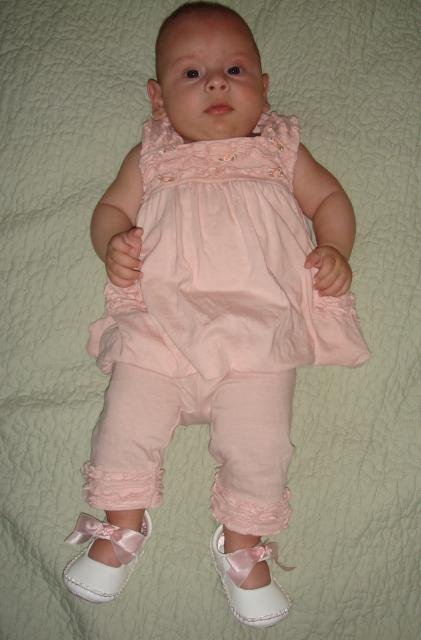 Днес Виллиан беше много интересна, сама си държи биберона и си го слага в устата , поиграе си и пак го извади, пуща си и сама музиката на люлката /висят играчки над нея като на активните гимнастики и като дръпнеш играчката музиката започва да свири/ голям смях падна  Joy, а от два дни така е започнала да пее че днес не можехме да чуем телевизора от нея  Grinning.Изобщо много ми е сладка не мога да се стърпя да не ви я покажа.