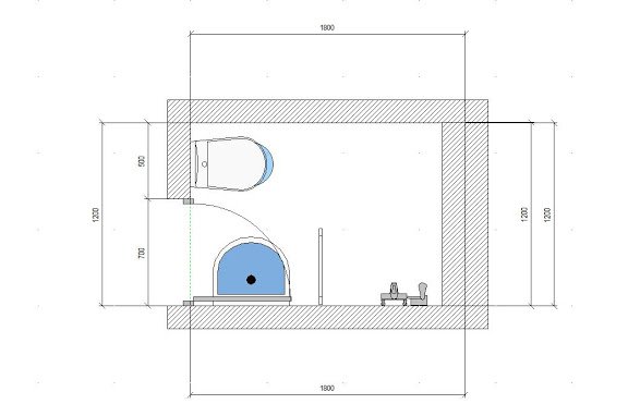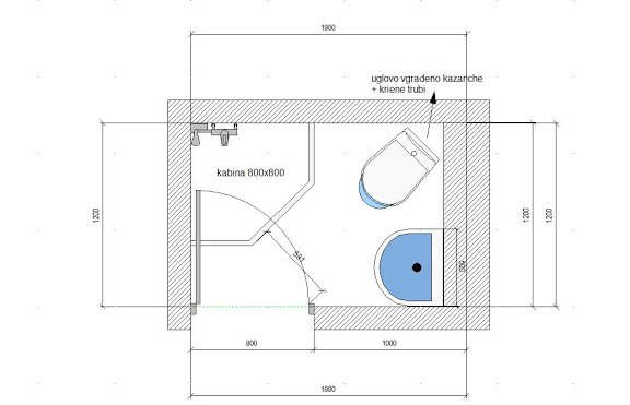 Ето иначе и др. разновидност на твоя проект 1 - тоалетната е под ъгъл - така ще има възможност за преграда между душа и нея (аз даже ексцентрично сложих кабина 800х800, за да видиш как е Simple Smile Тук обаче трябва да се провери влизането в банята дали ще е ОК (кабината ще стесни “прохода“), но при евентуална възможност за преместване на вратата вдясно може да си стане супер Simple Smile, а и тогава кабината може и да е по-голяма 850х850