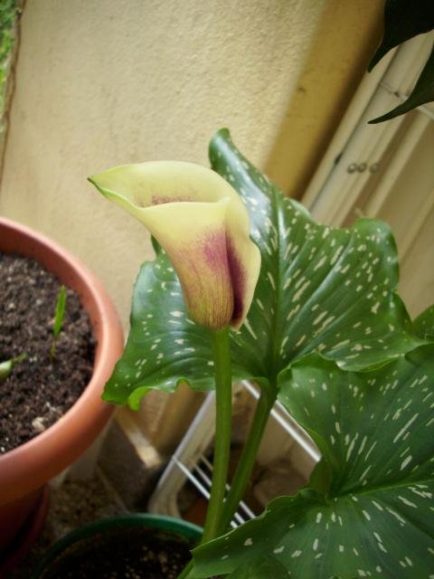 Месечинка виторога ,това е кала "Пикасо". Направо не ми се вярваше,че ще цъфне при мен такава красота.