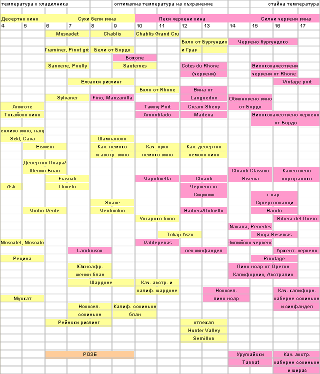 А по отношение на температурата zа пиене... оптималната температура zа повечето червени вина е 18 - 20 градуса. По леките червени вина се пият дори иzстудени до 13 градуса. При белите вина препоръчват температува около 13 - 16 градуса. Ако виното се иzстуди прекалено много, тогава се подтискат вкуса и аромата.Точно това ме притесни снощи като отворихме една бутилка Божоле и някак си ми убягна вкуса и аромата му!!! Затова яхнах метлата и дойдох да питам тук!