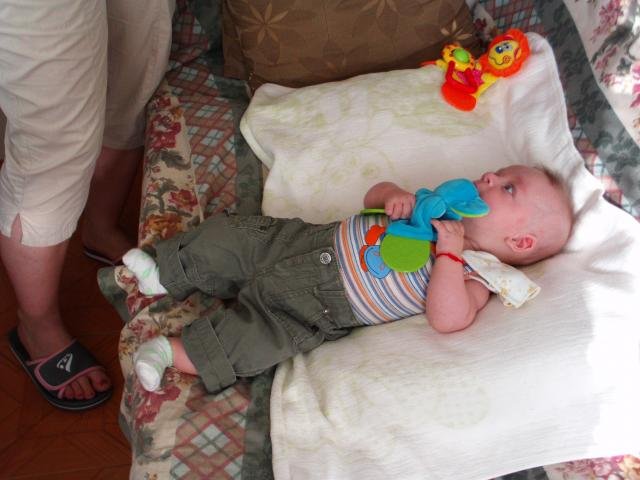 А тук не стига, че сме с панталони, ами и леко оповръщани, затова е и кърпичката на презрамката на бодито, а ризата с късо ръкавче, с която беше нагизден, вече отдавна е за пране, за сметка на това стискаме любимата си играчка ("онова петроленото", както го нарича баба ми - шивачка с дългогодишен стаж) Simple Smile