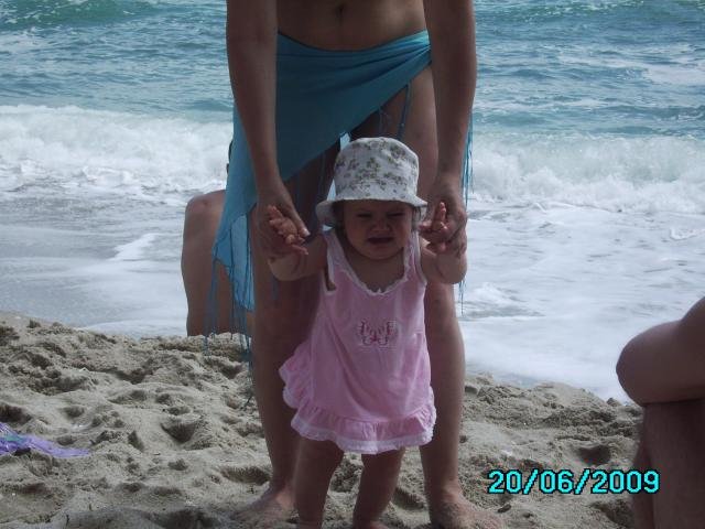 Водата е доста студеничка все още. Теди се страхува от водата и от пясъка не смее да стъпи на земята, но иначе си похапна доста пясък.