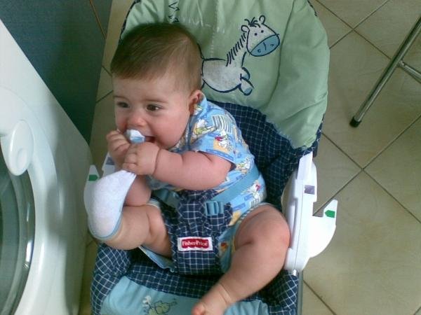 Още нямаме зъби и не говорим, само непрекъснато прави б-б-б с уста и прави балончета, дори и като яде пюре (познайте къде отива пюрето  hahaha). Пюретата ги яде с променлив успех - кога повече, кога по-малко, но още максимум по 60 гр., така че не можем и да мислим за заместване на хранене.