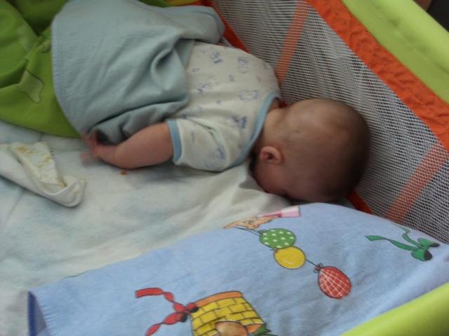 А на тази се опитва да се задуши, ама неуспешно слава богу, нали обича да се обръща по корем сега и така е и заспал, ама не се е сетил да си врътне главата настрани и личицето му е точно в една дупка, която се образува от чаршафа и матрачето на сгъваемата кошара, татито побърза да го снима преди аз скорострелно да го обърна по гръбче и съответно да го стресна подобаващо...