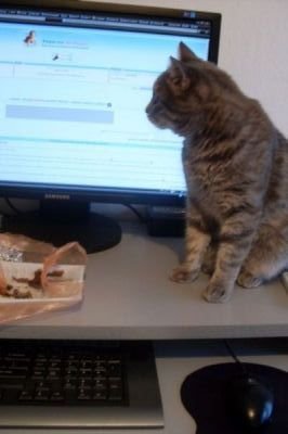 Извинявайте за спама, но не се въздържах... Нали почивам и днес стоейки сама в нас, реших да ям дето се казва просташки и си взех от кварталното рибно ресторантче в тарелка риба за вкъщи. Да си я изям както съм си ей така пред компютъра. И дзерът уж че не яде хорска храна... обаче веднага дотърча.