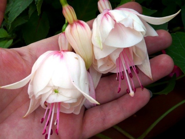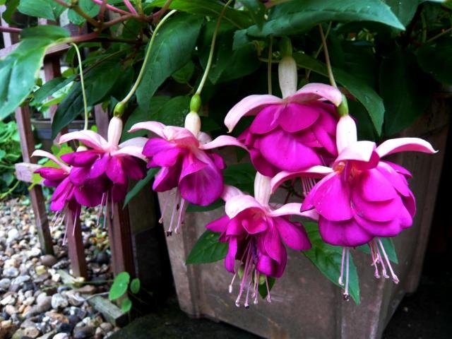 Много харесвам фуксии, Тези с кичестите цветове са за саксия, някои растат нагоре като храстче, други висят надолу (каскадни). И двата вида израстват около 40см високи за около два месеца, цъфтят още два месеца, а за зимата ги режа до нула.
