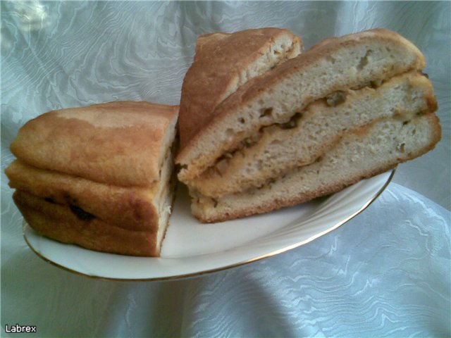 300-400г настърган кашкавал + 1ч.ч. пр.мляко + 4-5 яйца +  2-3 с.л. брашно + черен пипер + индийско орехче. Сега добавих и малко гъбки и определено много ми хареса така!