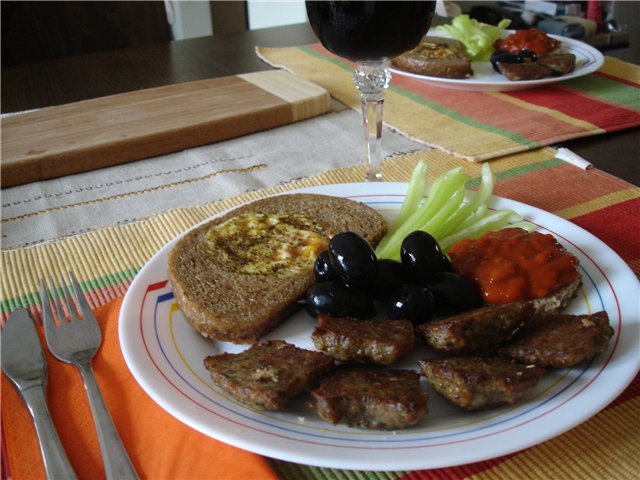 Това всъщност са издълбани с чаша филийки, запържени в чесново масло с едно чукнато яйце в отвора - от двете страни. Кръгчето от хляба също го запържих и го ползвах като канапенце за лютеничка. Другото са кюфтенца и украси.