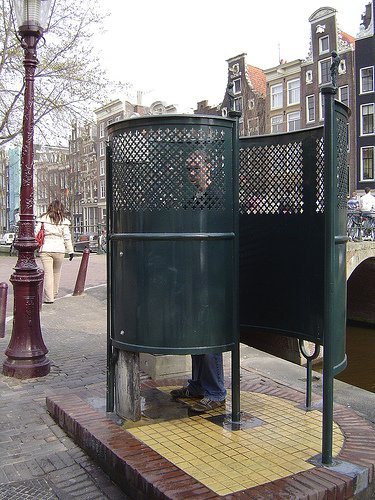 малко офф-топик, но който е ходил в Амстердам, не може да не е видял една местна забележителност по доста улици покрай каналите - тоалетна на тротоара, която представлява ето това: