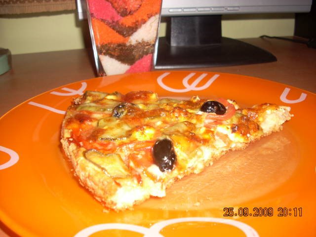 и аз направих бърканата пица; спазвайки пропорциите рискувах с блат от пълнозърнесто брашно+пшеничени трици; стана супер Heart Eyes: вкусно и пулезно, както се казваше в една реклама:D: