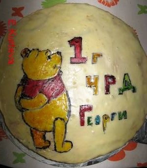 Ето и от мен една торта. Исках да направя Мечо Пух с трансфер, но след 2 неуспешни опита рисувах направо върху шоколадовата глазура!
