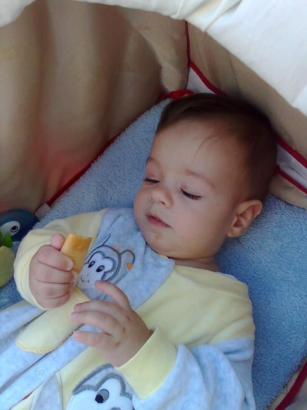 Жорето сутринта влезе с бойна крачка и без никакви проблеми - едва изчака да му обуем пантофите,само сочеше стаята с децата и казваше "там".Като влезе ,изобщо не ни обърна внимание и докато говорехме разни неща с лелите ,не се чу да се сърди.Казаха ни ,че ако не плаче много ,ще го вземем на обяд ,за да не седи цял ден - нали му е първи и да не му дойде много.Мъжо го взе към 13.30  - заплакал е веднъж и ме е търсел,но са го забаламосали с играчки и е престанал,но мъжът ми като отишъл,плачел.Като цяло са много дололни от него ,за първи ден се справил много добре.Сутринта закусвал,на обад си изял и мусаката и десерта,само таратора не харесал.