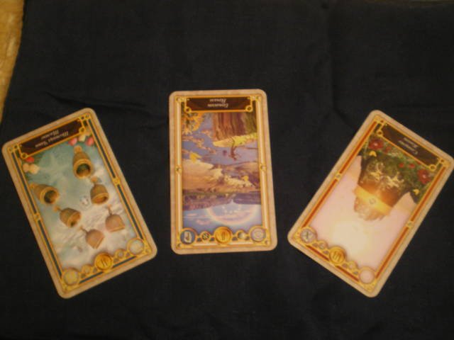 Здравейте момичета,това по- горе показаното е опит от моя страна да покажа картите които са изтеглени.Забравих да уточня кои са,вероятно не се разчитат добре от всички.Всички карти са обърнати-1.6 чаши ;2.глупакът ;3.слънцето