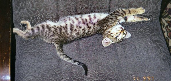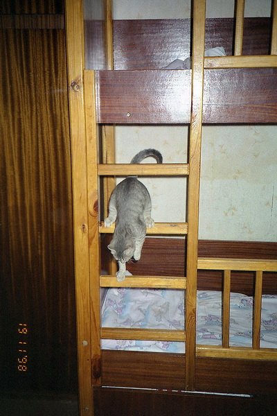 Двуетажното легло още съществува в Пловдив и Мъро продължава да се качва и слиза по стълбата като човек. Когато Мацо имаше достъп до него скачаше от околните по-високи места и изобщо не се сещаше за какво е тази стълба Grinning. Освен това като малък Мъро имаше много по-ясно изразени райета. Сега е почти едноцветен. След още някоя година и ще заприлича на синя руска котка hahaha.