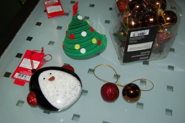 Аз имам играчки за елха от Марк и Спенсър от миналата година. Хубави са. Пластмасови и перфектни за 3 годишен младеж, който винаги може да събори елхата.