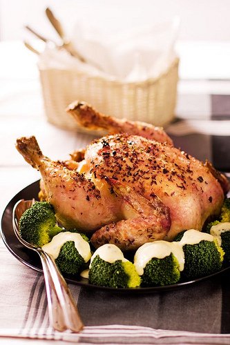 от мен едно печено пиленце с билки, гарнирано с броколи с  грюйер и холандски сос
