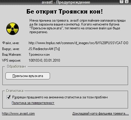 Проблемът е идвал от подписа на потребител - поставена бе картинка от сайта fmplus, от който идва "заплахата".