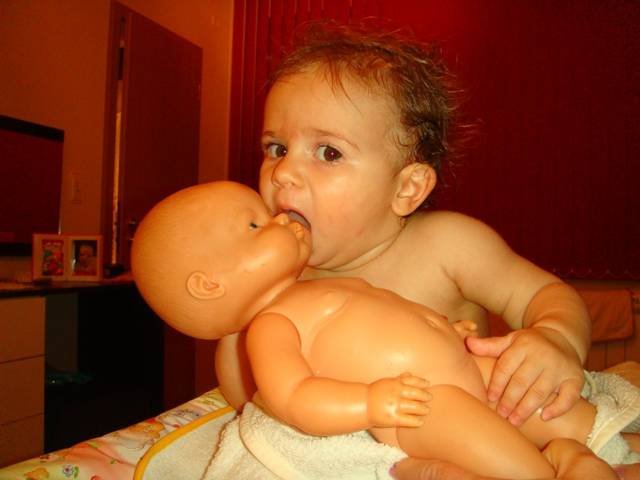 Моята малка бисквитка ще е голям егоист ( това по думи на баща и), първо изговори името си, непрекъснато: " Ада, Ада .....", вика батко си по име, казва много съсредоточено "ДА" и други думички. Много се радва на кукла си, една такава умилителна физиономия, показва и очичките и носа.